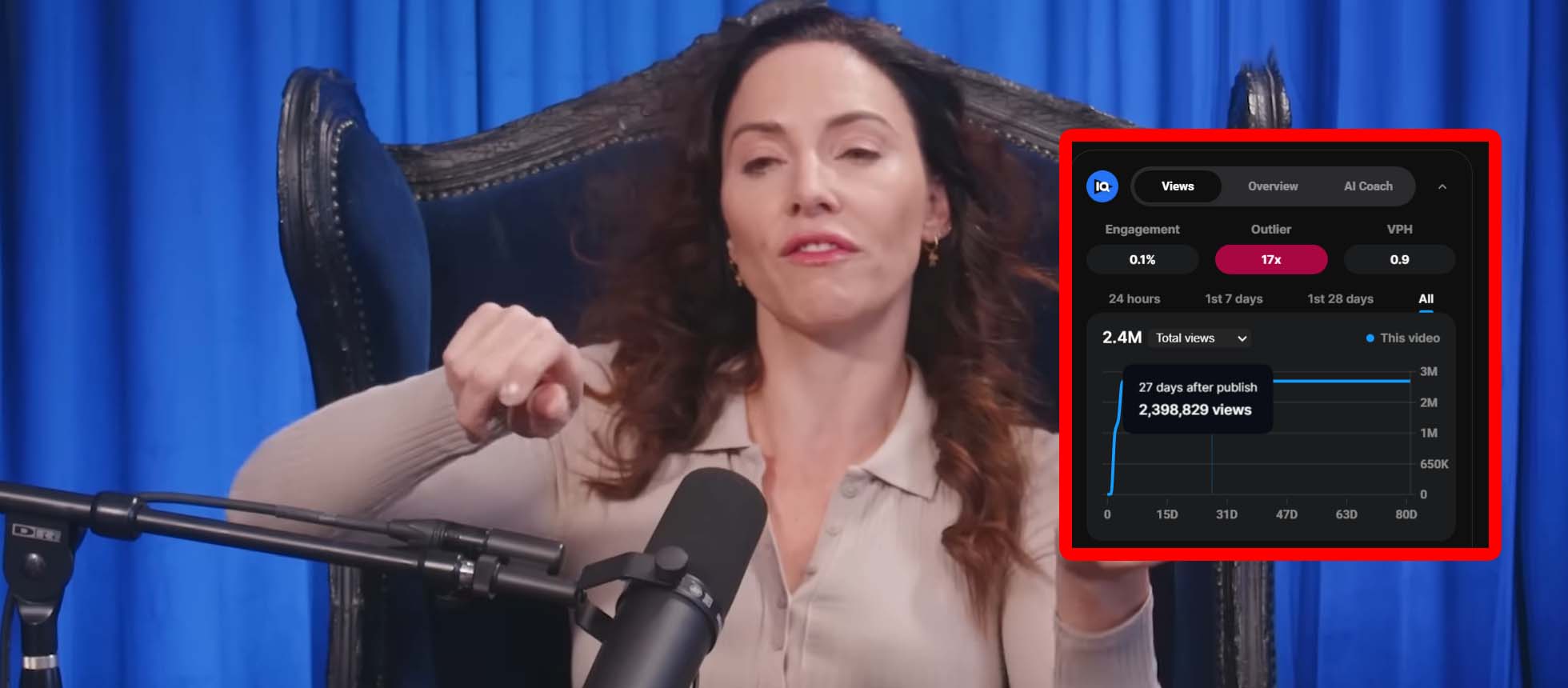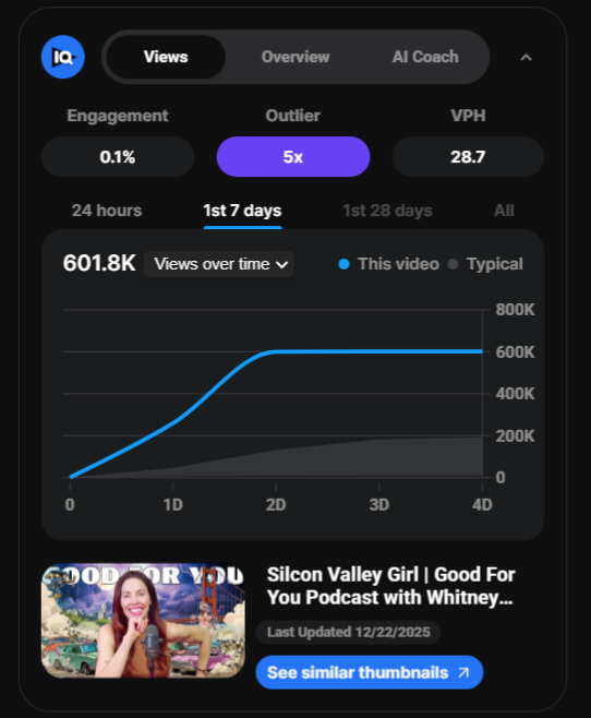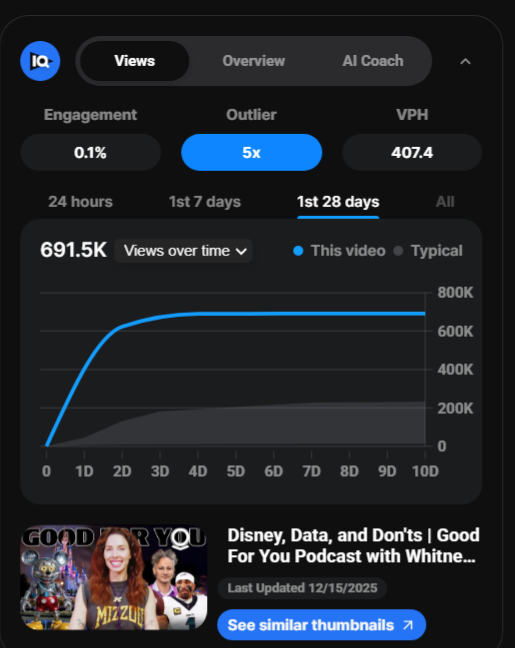 Recent episodes continue this pattern. A Thanksgiving-themed episode reached 2.1 million views in one month with just over 200 comments and a like-to-dislike ratio of 1,300 to 1,900. Another episode filmed in her living room during a self-described detox pulled 1.5 million views with 137 comments. A more recent upload achieved 1.2 million views in three weeks with only 157 comments and an almost even split between likes and dislikes.