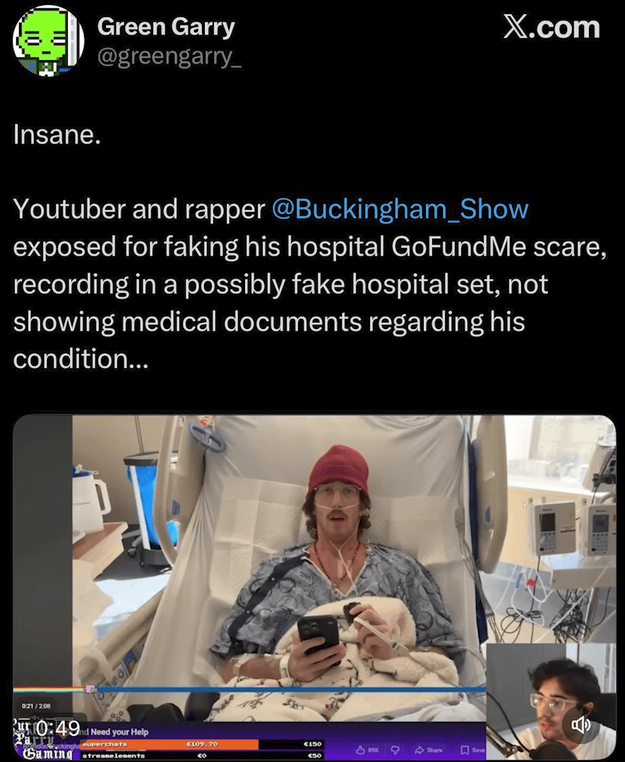 The AI photo was part of a larger campaign of false claims made while Buckingham was hospitalized. Content creator Purple Parry Gaming had initially gained traction by claiming Buckingham was faking his hospitalization, pointing to his IV pump not being plugged into a wall outlet. The device runs on batteries, making the accusation baseless.
